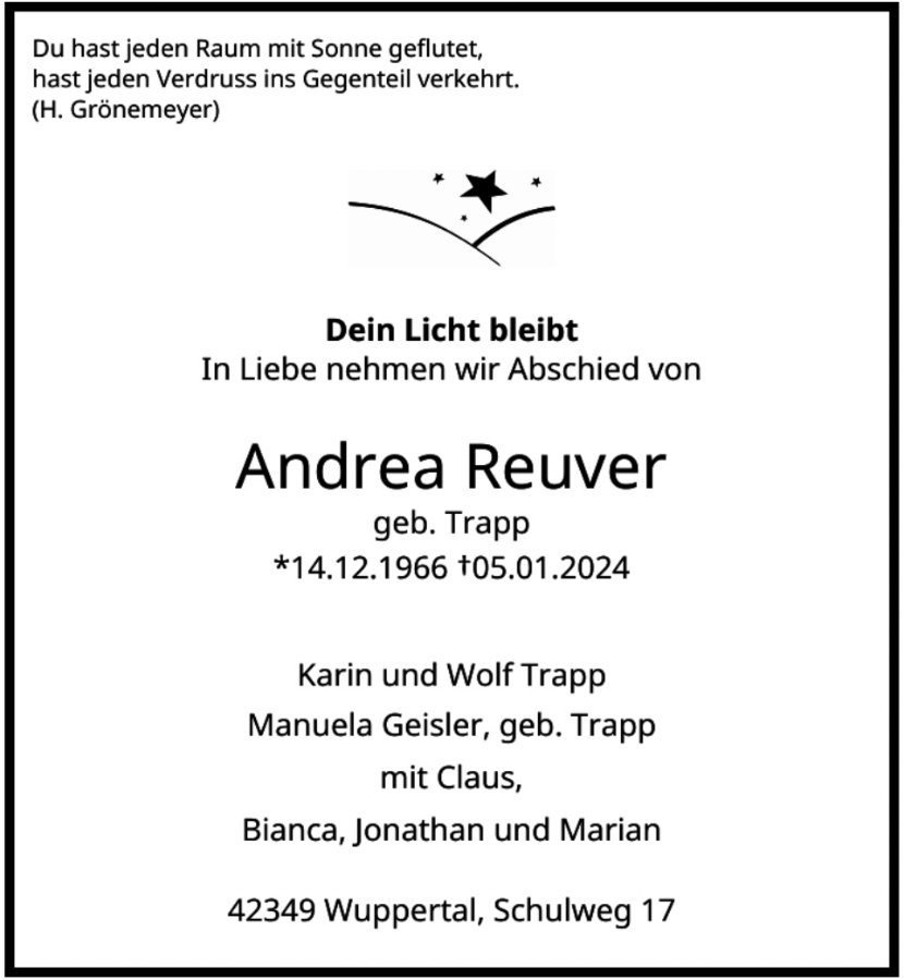 Ich wünsche euch Mut zur Trauer und Kraft und Zuversicht für die Zeit ohne Andrea.