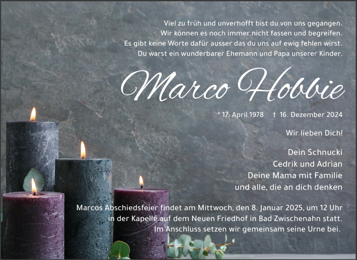 Viel zu früh und unverhofft bist du von uns gegangen. Wir können es noch immer nicht fassen und begreifen. Es gibt einfach keine Worte dafür ausser das du uns auf ewig fehlen wirst. Du warst ein wunderbarer Ehemann und Vater unserer Kinder. Wir lieben Dich